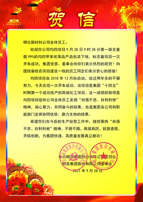 2021年9月28日上午9:28,第一袋均四甲苯合格产品承载着威廉希尔500欧洲指数人的殷切期盼,顺利完成包装下线,标志着明化新材料公司均四甲苯项目一次开车成功。